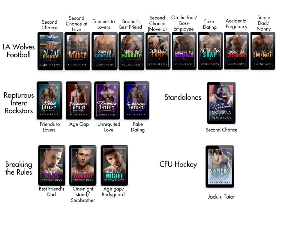 Hey, I’m Cadence, your friendly, neighborhood romance writer. By day, I look like an average frazzled mom of two toddlers who rarely does her hair (a mom bun totally counts, right?). By night, I let my imagination fly and write steamy scenes that have taken several of my closest friends by major surprise. I love writing heartfelt stories with relatable characters and a guaranteed happily ever after. Thanks for checking out my books!